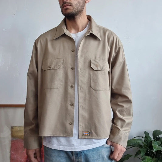 Vintage Dickies Boxy Fit Cropped Shirt Long Sleeve XL plain Beige Button Up Skater Y2K Surf